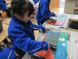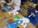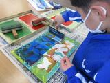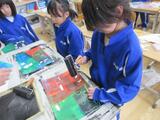 3年生が図工で、「ぬのでえがくと」に挑戦しています。色や模様・さわり心地がいいなと思った布を選んで、並べたり重ねたりしながら画用紙に貼り付けていきました。