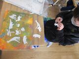 そこにローラーで色をのせ、またその上からシールを貼って色をのせていきます。それを何回か繰り返して…