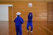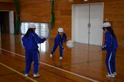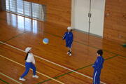 3年生が体育の時間に、プレルボールをしています。プレルボールとは、ボールをバウンドさせて決められた回数内でパスしたり、相手コートに返球したりして、得点を競い合うゲームです。