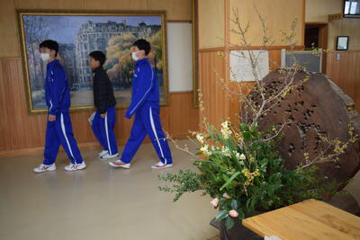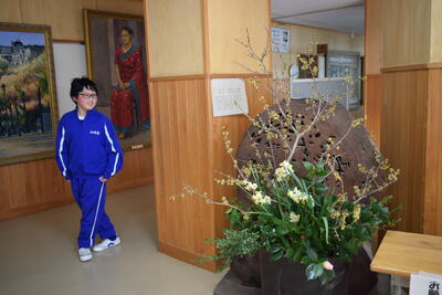 小学校玄関に生けてくださったロウバイが、黄色の花を咲かせました。地域の方がお花を生けてくださった2月はじめには、まだまだつぼみは固く閉じたままでしたが、日中の暖かさに誘われて開花したようです。