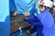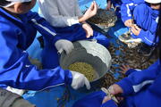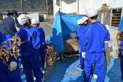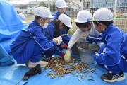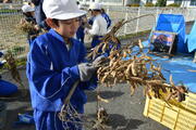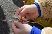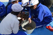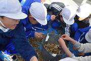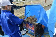「足踏脱穀機」を使った後は、手作業で大豆の粒を集めていきます。子どもたちは、こぼれ落ちた大豆はもちろんのこと、さやが破れなかったものも全部ていねいにひろい集め、大豆を収穫していきました。
