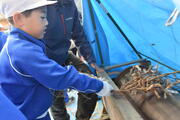 子どもたちは、初めて使う道具や作業にとまどいながらも、「大豆が飛び出てくるー」と歓声を上げながら、楽しそうに作業をしていました!